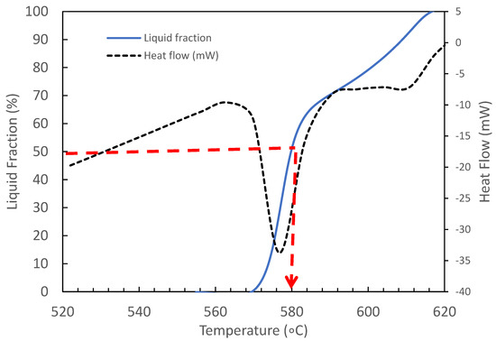 The heat flow and liquid fraction versus temperature of an A356 aluminium alloy/GNP composite was determined by the differential scanning calorimetry (DSC) technique which is shown in Figure 3. Differential scanning calorimetry analysis was performed on a Mettler Toledo TGA/DSC1 in an argon-controlled environment. A high-purity alumina pan was used as a reference material. The mass of the specimen used for DSC analysis was around 10 mg, and the sample was cut from the centre of the as-received alloys. The sample was then heated to 700 °C with a heat rate of 10 °C/min and purged with a neutral nitrogen gas atmosphere to prevent severe oxidation. The temperatures at the beginning and the completion of solidification are called the liquidus temperature Tliquidus and the solidus temperature Tsolidus, respectively. The solid line is the liquid fraction curve and the dashed line is the heat flow. A solidus temperature of 568 °C and liquidus temperature of 616 °C were achieved. The thixoforming involves reheating the billet from the solid to the semi-solid region. Thus, it shows that the semi-solid region of 30–50% liquid fraction is between 577–580 °C. Therefore, the thixoforming temperature would suggest that 580 °C was the maximum temperature before the liquid fraction of 50% was exceeded.
