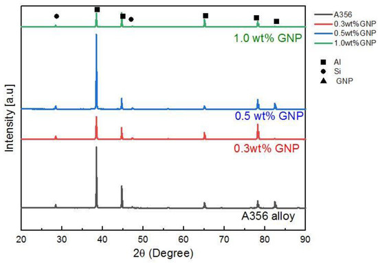 Figure 5 illustrates the XRD spectra of the Al monolithic alloy and Al-GNPs composites consisting of disparate weight fractions of GNPs. There are several peaks comprising peaks of Al and Si. The distinct peaks correspond for Al detected at several places such as at 38.47°, 44.72°, 65.10°, 78.23° and 82.44°. However, no peaks of GNPs are observed because of the low graphene content and the limited resolution of elements of X-ray diffraction. Research studies by Shao et al. [29] and Lou et al. [30] have also reported these findings on the absence of GNPs. In addition, there was no obvious peak of the aluminium carbide (Al4C3) phase found, thus proving that there was no chemical interaction between GNPs and Al alloy. Hence, this suggests that high-quality GNPs/Al composites were fabricated by the thixoforming process. The billet was reheated to a semi-solid temperature before the formation process, and thus the GNPs did not react with the aluminium on the grain boundaries.