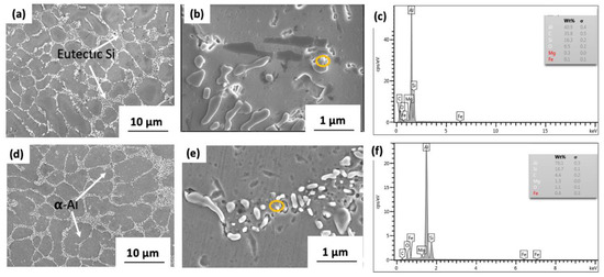 Meanwhile, the microstructure α-Al phase in the thixoformed composite becomes more globular with increasing GNP contents. Furthermore, grain refinement improves the strength and plasticity as the grain size is in microns [15]. The backscattered electron microscopy images reveal the distribution of eutectic Si (light grey areas indicated with white arrows), α-Al matrix (a dark grey area) and EDS spectrum of the selected area in Figure 6c,f.