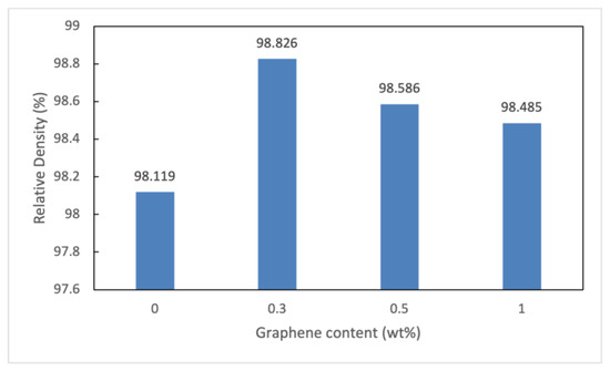 Figure 8 shows the relative density of composites which is essential for determining the performance of a material. The relative density () of the developed composites was determined using the measured density () and the theoretical density values () as indicated in Equation (2). The relative density of 0.3 wt.% GNPs/Al composite is the highest at 98.82%, suggesting that it has the lowest porosity and the densest as compared with others. The relative density decreases significantly with increases in graphene content. The presence of pores and agglomeration of graphene sheets at the grain boundaries of the Al matrix can cause a reduction in relative density [25]. The GNP cluster was found in composites containing 1 wt% GNPs, which were responsible for the existence of porosity and decrease in the relative density. The evidence of the presence of clusters may be witnessed in Figure 7d,f, which also show the cluster encapsulating the smaller aluminium particles. These clusters cause a decrease in the density of composites and the effects appear significantly at higher values of GNPs.