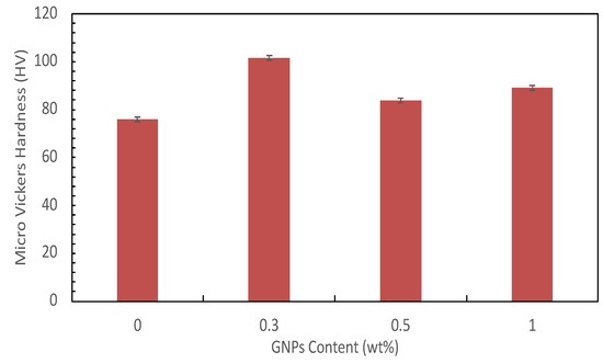 Figure 9 shows the hardness of each composite at varying GNP contents. Overall, the composites’ hardness value is superior to that of the Al alloy. The addition of GNPs has a significant influence on the hardness increment. The hardness was enhanced by more than 29% when 0.3 wt.% GNPs were added, from 78 HV to 101 HV. However, as the GNP content increased, the hardness value tended to decrease. This trend is highly associated with changes in density and the microstructures. As discussed earlier, the 0.3 wt.% GNP/A356 composite with the highest relative density exhibited the highest hardness.