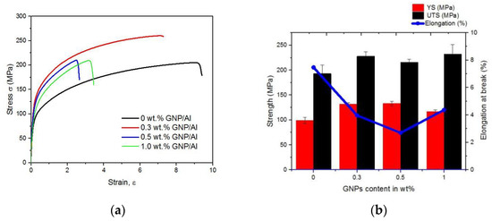 The tensile stress–strain curve of Al and composites with variation in GNP content are shown in Figure 10a. Hence, the ultimate tensile strength (UTS), yield strength (YS) and fracture elongation are shown in Figure 10b to further analyse the trend changes in mechanical properties of GNPs/Al. The value of UTS, YS and elongation are summarised in Table 3. It is seen that the UTS and YS of nanocomposites compared with unreinforced alloy received remarkable enhancements. As compared with Al alloy, the ultimate tensile strength of 0.3, 0.5 and 1.0 wt% GNPs/Al composites increases by 27% (246.5 MPa), 11% (215.0 MPa) and 19% (231.6 MPa), respectively, and the yield strength increases by 43% (141.5 MPa), 34.6% (132.67 MPa), 19% (117.3 MPa), respectively. The addition of 0.3 wt.% of GNPs improves the ultimate tensile strength and yield strength by almost 50% of that measured for Al alloy.