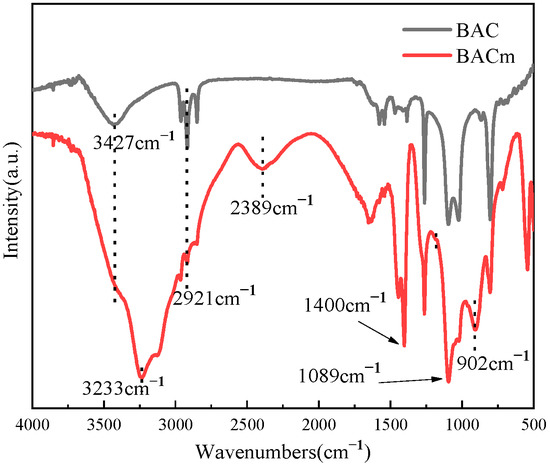 The FTIR results of BAC and BACm were illustrated in Figure 1, and typical peaks of BAC were seen at 3427 cm−1 (–OH), 2921 cm−1 (C–H) and 1025 cm−1 (C–O) [38]. In contrast, after temperature controlled grafting with phosphoric acid and urea, characteristic peaks of hydroxyl and carboxyl groups intensified significantly and new peaks appeared for the BACm samples. The emerged peaks at 3131–3233 cm−1, 2389 cm−1, 1400 cm−1, 1089 cm−1 and 902 cm−1 were attributed to asymmetric stretching of –NH4, O–C–O, C–N bonds, symmetric stretching of P–O and P–O, respectively [39,40]. The appearance of these characteristic peaks proved the successful synthesis of P/N-containing samples.