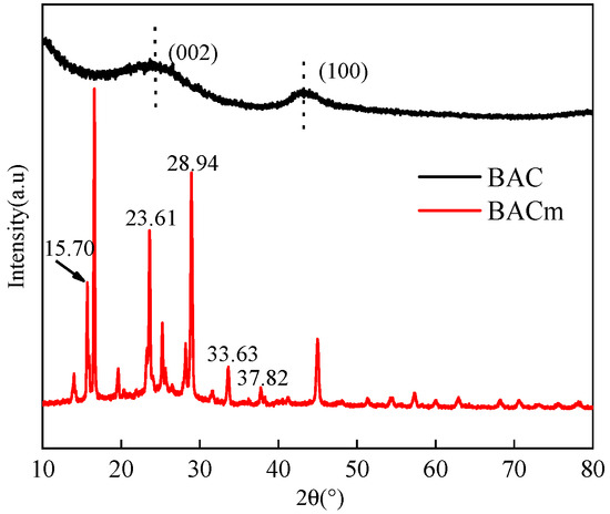 XRD analysis was employed to further verify the differences between BAC and BACm. As can be seen from the Figure 3, BAC did not show any sharp diffraction peaks, indicating the amorphous structure of carbon. The peaks of BAC at 2θ = 20°–30° represent carbon reflection from the stacked structure of the aromatic layer (002) [39,40,41,42,43], and the peak at 2θ = 43° indicated that pyrolytic carbon comprised of hexagonal structure (100) [44,45,46]. BACm had a series of crystal structures, e.g., 2θ = 15.7°, 23.61°, 28.94°, 33.63° and 37.82°, which suggested it had gained a crystal structure similar to the traditional flame retardant, ammonium polyphosphate(APP) [39,47,48,49], reassuring the successful grafting of P/N elements.