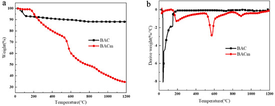 The TGA and DTG curves of BAC and BACm were depicted in Figure 4, and it was always easy to distinguish the pyrolysis differences between BAC and BACm. BAC experienced relatively small mass loss in the pyrolysis process, and the ultimate carbon residue rate ended up being 88.28 wt.%. The mass merely varied at a temperature of 200 °C and beyond, whereas on the other side, the carbon residue rate of BACm dramatically fell to 49.25 wt.%, and two main decomposition stages appeared, which were 150 °C–510 °C and 520 °C–1200 °C, respectively, corresponding to the evaporation and dehydration of water molecules and small molecules of phosphorus compounds, release of nitrogen-containing gases and further carbonation and thermal degradation of carbon residue in the process of heating up [50,51]. Equivalently, it was determined that gas-phase and condensate-phase flame retardants were generated during the combustion, which could also explain the reduction of BACm carbon residue compared to that of BAC.