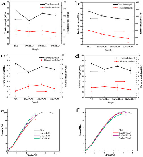 Typical tensile stress-strain relationships for PLA/BAC and PLA/BACm composites were shown in the Figure 5e,f. Neat PLA posed with stronger non-linearity and ductility compared with the studied composites. BACm/PLA composites managed to overtake the BAC/PLA counterparts in ductility, which was approximate to that of neat PLA, the reason for which may lie in the fact that there is better compatibility of BACm with PLA, and the rough surface of BACm, or more functional groups conducive to the formation of hydrogen bonding and physical linkage with PLA molecular chain, eventually reduce the negative impact on the mechanical performance of the PLA matrix.