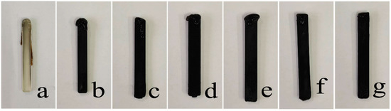 Digital images of composites after LOI tests: (a) PLA, (b) BAC/PLA3, (c) BAC/PLA6, (d) BAC/PLA9, (e) BACm/PLA3, (f) BACm/PLA6, (g) BACm/PLA9.