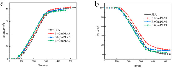 Cone analysis result of PLA composites: (a) THR, (b) mass loss of PLA, BACm/PLA3, BACm/PLA6 and BACm/PLA6, (c) HRR.