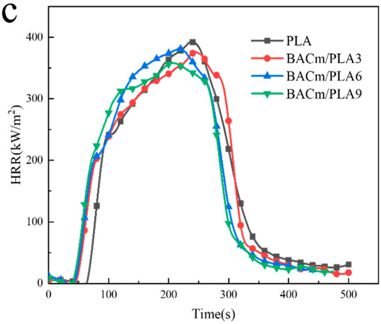 The CONE results also indicated the composites’ HRR and mass loss rate (MLR) had been superbly restrained, which proved to have a protective effect on the PLA matrix from flame interference. The emerging of a carbon layer built a robust firewall against the invasion of flame, oxygen and other flammable volatile gases. Nonetheless, inadequate loading of BACm in the composites in this work could not produce a continuous carbon layer, protecting PLA matrix as well.