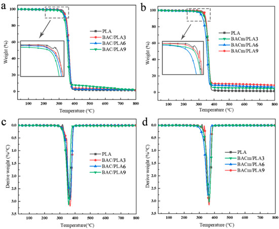 Neat PLA set about to quickly degrade at 322 °C, as recorded in Figure 8a, its Tmax reached 363 °C and virtually all mass was lost at 400 °C. The corresponding carbon residue rate was determined at merely 1.35% at a terminal temperature of 800 °C; by contrast, acidic additive (phosphates) stimulated earlier decomposition of PLA composites when BACm was applied, which was in accordance with the previous TGA results. As seen in Table 5, the carbon residue rate increased progressively with BACm loading in the composites; notably, the actual rates of BACm/PLA composites attained a result of 4.44 wt.%, 6.42 wt.% and 8.60 wt.%, and outweighed 59.1%, 52.1% and 51.9% over that of the theoretical carbon residue rate results (2.79 wt.%, 4.22 wt.% and 5.66 wt.%, respectively, as calculated), which confirmed strengthened thermostability of composites with BACm application. The Tmax barely differed for the neat PLA and BACm/PLA composites, which was, 363 °C, 364 °C, 357 °C and 363 °C, respectively. Thus it can be followed that BACm loading did not exert influence on the PLA degradation [51]. In the range of 600 °C to 800 °C, as seen in Table 5, the residue of PLA combustion saw no mass variation, yet a slight mass loss can be observed to a certain extent, and it demonstrated a postponed combustion of composites since the BACm addition.