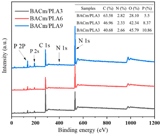 XPS spectra of the residue char of BACm/PLA composites after the cone calorimeter test.