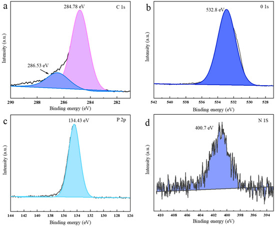 Corresponding spectra were shown in Figure 12 for elements distributing on the surface of the carbon residue of BACm/PLA9. It was observed that the C1s spectrum in Figure 12a can be deconvoluted into two peaks at 284.7 eV and 286.5 eV, respectively, corresponding to C–C and/or C=C bonds in aliphatic or aromatic species and C–O in P–O–C groups, respectively. As shown in Figure 12b, the binding energy at 532.8 eV was assigned to –O– in C–O–C and/or C–O–P groups [55]. The peak at 134.4 eV of the P2p spectra in Figure 12c and 400.7 eV of N1s spectra in Figure 12d correspond to the P–O–P and the C–N bonds [56], respectively. The results show that BACm leads to the formation of a dense carbon layer containing P and N elements that are ultimately reflected in the detection of C–O–P, P–O–P and C–N bonds from the residue; namely, versatile flame retardancy of BACm in this work could be guaranteed based on the synergistical effect of P and N elements in the formulations.