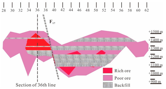 Downward filling mining has been adopted in mining area No. 3 for several decades, resulting in the formation of a filling body with a huge volume in the goaf (Figure 2) [40]. The nickel grade (mass ratio) more than 1% is rich ore, less than 1% is poor ore. In order to further improve the mining efficiency, several working faces have been set up. The height of a single section is 20 m, and each section is divided into five sublevels with heights of 4 m. According to the actual mining schedule, the ore between +1210 m and +1190 m was excavated first via single section mining. Then, mining was begun at +1454 m, +1354 m, and +1254 m at the same time, and the sublevels with heights of 4 m were continuously mined downward until +1410 m, +1310 m, and +1210 m were reached, respectively. Finally, the remaining ore body was excavated through double section mining. The entire mining plan is shown in Figure 3.