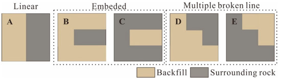 It can be seen from Figure 2 that the geometric shapes of the BSCZs are complex and regular. The drift fill stoping method was employed in the study area, and the filling was immediately carried out after the mining, so the filling body had a regular rectangular boundary. According to the different geometric shapes, the BSCZs can be divided into 3 modes, including a linear model, embedded model, and multiple broken line model, which can be subdivided into five types from A to E (Figure 4).