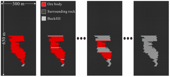Using the Fast Lagrangian Analysis of Continua 3-D (FLAC3D) software, the 36th line section was selected as the research object to simulate the entire resource mining process in the study area. The model had a size of 650 × 300 m, with elevations of 1750 m at the top and 1100 m at the bottom, and was divided into square grids with a side length of 4 m (Figure 5). The physical and mechanical parameters of the surrounding rock, ore body, and backfill adopted in the model are presented in Table 1. The horizontal displacement on the left and right sides and the vertical displacement on the bottom were limited [41]. Gradient in situ stresses were applied inside the model, and the ground stress in the study area was calculated as follows [42]:
