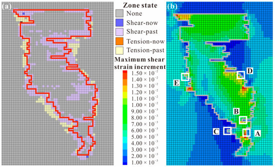 Figure 6a shows the distribution of the plastic zone around the mined-out area. It can be seen that the filling body and surrounding rock were relatively stable, and the plastic deformation mainly occurred near the contact zone, which was similar with the results obtained in the references [16,42]. Moreover, the failure was mainly concentrated in the filling body, and shear failure was dominant. In addition, the plastic zone was obviously concentrated near the thin filling body, where both the backfill and surrounding rock were prone to failure. According to the cloud diagram of the maximum shear strain increment shown in Figure 6b, it can be seen that strain concentration was most likely to occur at the inflection point of the contact zone, and dislocation deformation was most likely to occur on the contact surface. The five BSCZ types classified in Figure 4 exist in the actual mine, and strain concentration occurred around all of them, so they were weak positions affecting the global stability of the backfill. Excluding the increase in the shear strain caused by the thin layered backfill, BSCZs with similar burial depth were selected for comparative analysis. It was preliminarily concluded that for the multiple broken line model, the shear strain increment of type B, in which the backfill is located in the footwall, was greater than that of type C, and type C was more stable. In the embedded model, type E, in which the surrounding rock enclosed the filling body, was more stable than type D.