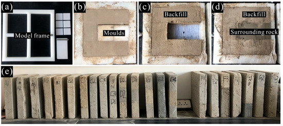 Self-designed polypropylene molds were used to make specimens of each BSCZ type. According to the needs of the test, the model frame with the size of 30 × 30 × 5 cm was fabricated, and the molds were designed according to the shapes of filling body and surrounding rock (Figure 7a). Firstly, the weights of cement, gypsum, and river sand were calculated based on the ratio of similar materials. Secondly, the ingredients were mixed well and water was slowly added. Then, the mixed material was poured into the frame which was painted with oil around the inner wall, and vibrated fully so that the bubbles could be discharged. A part of the specimen was fabricated first, and the other part was added after the first component was completely dry (Figure 7b–d). Finally, the models were demolded and the samples damaged in the process of maintenance and transportation were abandoned. Part of the specimens fabricated are shown in the Figure 7e.