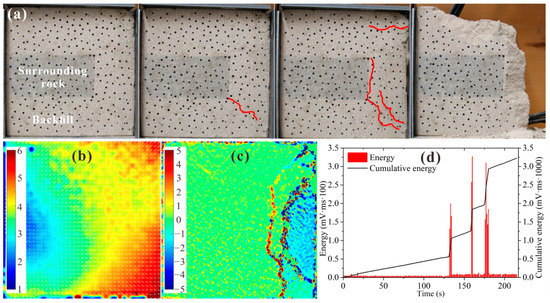 Figure 12 shows the test results for BSCZ type D. As shown in Figure 12a, in the initial stage of loading, longitudinal cracks formed at the seam between the filling body and surrounding rock. When the cracks reached the inflection point, they began to expand into the filling body. Two mutually distinct perpendicular cracks formed in the filling body and continued to develop. Finally, the cracks penetrated through the entire model, leading to the final failure. As shown in Figure 12b, the displacement of the specimen was mainly horizontal, the entire displacement field was oriented toward the filling body, and a large amount of displacement occurred around the seams. Figure 12c shows that a strain concentration zone running through the entire model formed inside the filling body, and it exhibited strong tensile shear strain. It can be seen from Figure 12d that the loading time of the specimen was short, and energy release events constantly occurred during the loading process. In addition, the energy released by each event was small, which was related to the large proportion of backfill, and the model exhibited strong plastic characteristics.