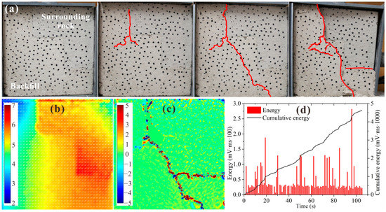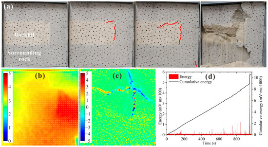 Figure 11 shows the test results for BSCZ type C. As shown in Figure 11a, as the loading increased, the fractures also appeared around the inflection point between the two materials at the beginning. However, in contrast to type B, the fractures did not develop toward the surrounding rock vertically, but they extended in two mutually distinct vertical directions along the seam until the cracks were connected. They finally exhibited inverted Y-shaped failure in the filling body. As shown in Figure 11b, the displacement of the specimen was mainly horizontal displacement, and the displacement of the surrounding rock on the right side of the filling body was large, which was the result of the overall inward extrusion of the surrounding rock. Figure 11c shows that an X-shaped strain concentration zone was formed at the inflection point in the upper right part of the filling body. The strain along the horizontal joint was mainly tension–shear strain, while the strain along the vertical joint was alternating tension–shear strain and compression–shear strain. It can be seen from Figure 11d that several energy release events occurred during the loading process for a long time, and these events corresponded to the generation and development of microscopic cracks in the model. When it was loaded to about 1000 s, the specimen experienced strong energy release and finally failed.