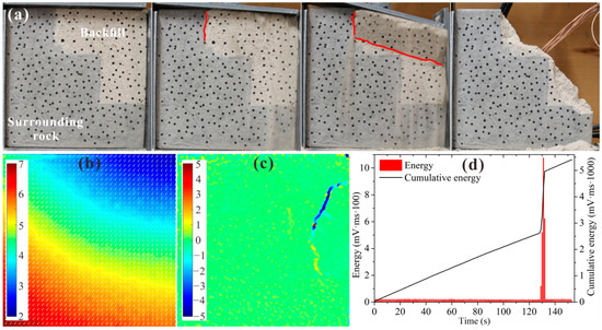Experimental results for type A. (a) Damage and failure processes; (b) displacement field; (c) strain field; (d) acoustic emission energy.