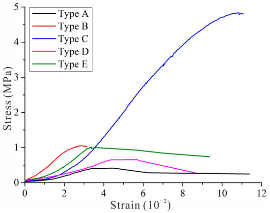 The horizontal stress–strain curves of each type of BSCZ are shown in Figure 14. It can be seen from Figure 14 that the strengths of the different types of BSCZs from largest to smallest are C, B, E, D, and A. That is, the strength of the embedded model was greater than that of the multiple broken line model, and the linear model was the most unstable. This is in good agreement with the results of the numerical simulations and the phenomena observed in the model tests.