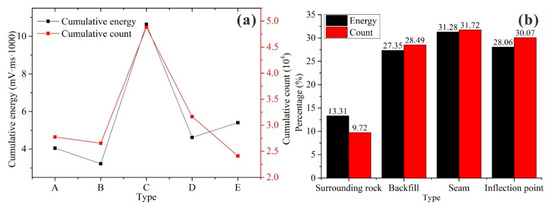Figure 15a shows the cumulative energy curve and cumulative count curve of the acoustic emissions from the different types of BSCZs. It can be seen from Figure 15a that the cumulative energy released from each specimen was almost positively correlated with the specimen’s strength; and the greater the strength was, the more energy was released. The energy released from type C was much higher than those released from the other specimens, which may be related to the longer duration of the test. The shape of the cumulative count curve is almost the same as that of the cumulative energy curve. However, in type D, more counts were used to release less energy than in type E, which may be related to the different proportions of the filling body and surrounding rock in each BSCZ.