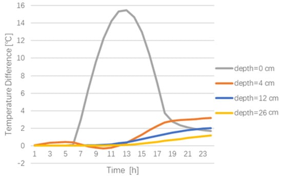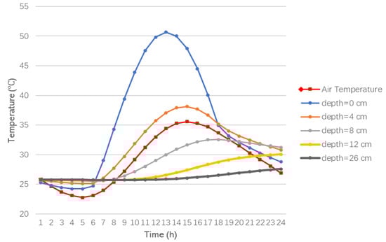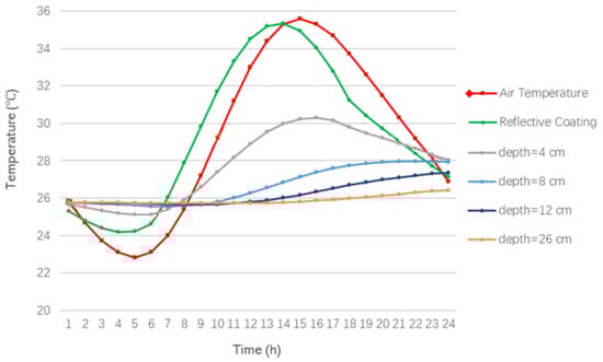 The analysis of the temperature changes at different depths in the model during the summer shows that the pavement heats up in summer under the effect of solar radiation. The temperature changes at different road depths within a 24 h day are shown in Figure 4.