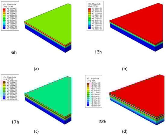 Solar radiation is applied to the surface of the road as heat flux. Heat flux refers to the heat energy passing through a unit area per unit time, and it is a directional vector. The variation of heat flux with time in the asphalt layers is shown in Figure 6. It reaches its highest at 13 h, and the variation in heat flux is consistent with the variation in temperature.