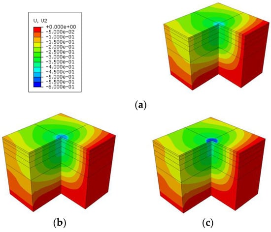 Distribution of the vertical displacement at different moments: (a) 6 h, 24.7 °C; (b) 22 h, 30.2 °C; and (c) 13 h, 50.1 °C.