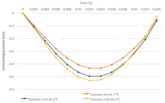 Vertical displacement of the center point of the asphalt surface course at different moments.