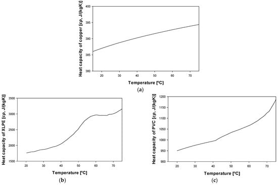 Temperature evolution of the specific heat capacity cp of the different cable materials: (a) Copper []. (b) XLPE []. (c) PVC [].