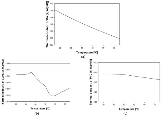 Temperature evolution of the thermal conductivity k of the different cable materials: (a) Copper []. (b) XLPE []. (c) PVC [].