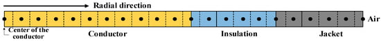As explained, the temperature of an insulated cable depends on two main factors, which are the self-generated Joule (I2r) heating and the externally ambient temperature. Thus, in general, heat flows radially from the central part of the conductor to the outer part of the jacket. The whole domain of the cable is discretized into many discrete elements along the radial dimension of the cable, as shown in Figure 4.