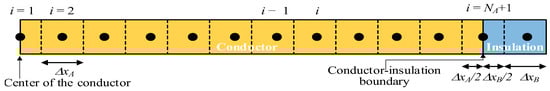 The conductor part (orange color) designated with subscript A includes NA nodal elements of thickness ΔxA (m) each, as shown in Figure 5, whereas the elements of the insulation layer are shown in blue color. An additional node is placed at the boundary between the conductor and the insulation layer.