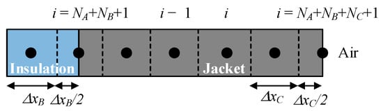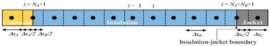 The elements in the inner insulation layer (blue color) are expressed with subscript B, which includes NB nodal elements, as shown in Figure 6, whereas the elements of the outer jacket are represented in gray color. An additional node is placed at the boundary between the insulation layer and the outer jacket.