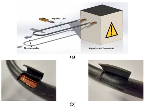 A high-current transformer (variable output voltage 0–3 V, variable output current 0–1 kA, and 50 Hz alternating current) was used to conduct the experimental tests carried out at AMBER high-current laboratory of the Universitat Politècnica de Catalunya. To regulate the output current, the transformer has an input stage that includes an autotransformer. A loop formed by the analyzed insulated cable was directly connected to the output terminals of the transformer, as shown in Figure 8.