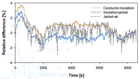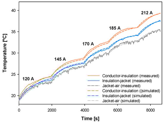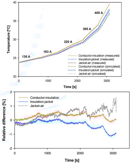 Figure 11 shows the experimental and simulated temperature profiles in the three measured points of the cable (conductor-insulation boundary, insulation-jacket boundary, and jacket-air boundary) for the five current levels.