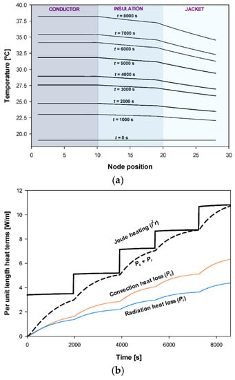 Conductor of 70 mm2: (a) Temporal evolution of the temperature along the radial axis considering 28 nodal elements. (b) Temporal evolution of the components of the heat balance equation.