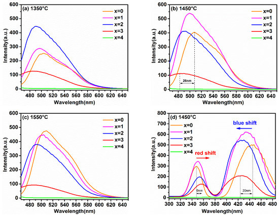 In order to reveal the relationship between the luminescence properties, the concentration of Ga3+ ions, and synthesis temperature, the PL and PLE spectra of the samples synthesized at different temperatures are recorded in Figure 4a–e. Figure 4e shows the relationship between the maximum emission intensity and sintering temperature at different Ga3+ concentrations. It can obviously be observed that the variation trend in the maximum emission intensity of samples with different Ga3+ concentrations with the increasing temperature was different. Furthermore, when the synthetic temperature was at 1550 °C, the emission intensity of sample with x = 0 was the strongest one relative to other Ga3+ concentrations of the samples; x = 1 was strongest at 1450 °C, and x = 2 was strongest at 1350 °C.