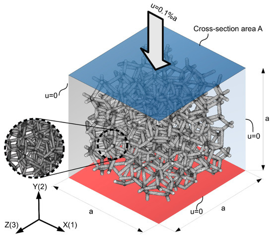 Boundary conditions corresponding to the uniaxial compression test along three perpendicular directions (1, 2, 3 coincident with the X, Y, and Z axis of the global coordinate system, respectively) were applied. Each of the LVT cellular structures was loaded with displacement equal to 0.1% of initial edge length a at one side and constrained on the opposite side with zero displacement in the actual direction of loading. Additionally, normal displacements of external nodes located close to each lateral face of the bounding box were coupled (see Figure 3). An algorithm for conducting the analyses was developed and implemented by means of the APDL language.