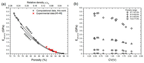 Average values of effective Young’s modulus Eeff AVG computed for designed aluminum open-cell foams versus (a) porosity and relative density and (b) coefficient of pore volume variation CV(V). Experimental values of Eeff AVG available for Duocel® foams are indicated using ‘x’ symbols.