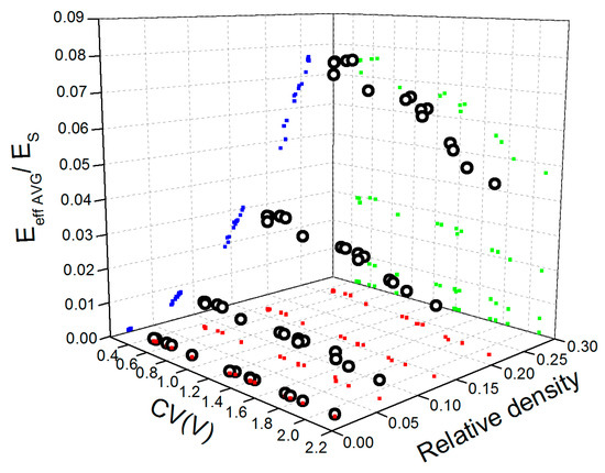 Average values of reduced Young’s modulus, Eeff AVG/Es (○), versus relative density and CV(V) calculated for the LVT aluminum open-cell structures and their xy (▪), yz (▪), and zx (▪) projections.