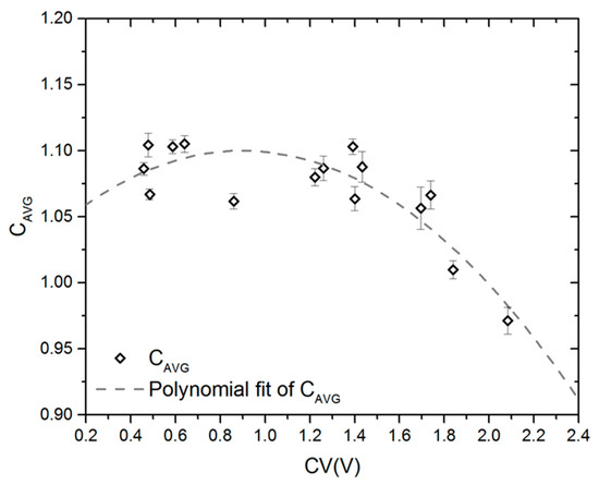 The value of the exponent n is broadly assumed as 2 for open-cell structures in many experimental reports available in the literature [34,35]. Nevertheless, the exponent is also a consequence of the deformation mechanism. When the struts are not aligned in the foam structure, bending at their intersection points (strut joints) or bending of the struts becomes dominant [33,34,35], and quadratic dependence of Young’s modulus on the relative density occurs. Computational data points reveal excellent fitting to the Gibson–Ashby model with the approximate value of R2 = 0.99 for each series. A coefficient corresponding to scaling factor C in the Gibson–Ashby model was calculated for each fitting curve y = axb (b = 2). Average values, denoted as CAVG, were plotted versus the coefficient of pore volume variation (CV(V)) in Figure 6.