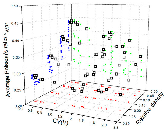 Data points representing values of average Poisson’s ratio calculated for the analyzed set of the LVT structures versus relative density and CV(V) are shown in Figure 7.