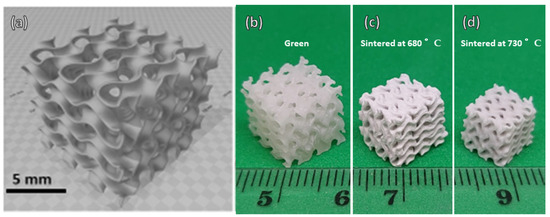 (a) Reference three-dimensional gyroid model; (b) printed gyroid before debinding and sintering; (c) gyroid after firing at 680 °C; (d) gyroid after firing at 730 °C.