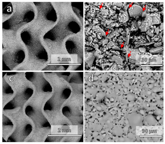 Microstructural details of gyroid scaffolds: (a,b) after firing at 680 °C; (c,d) after firing at 730 °C.