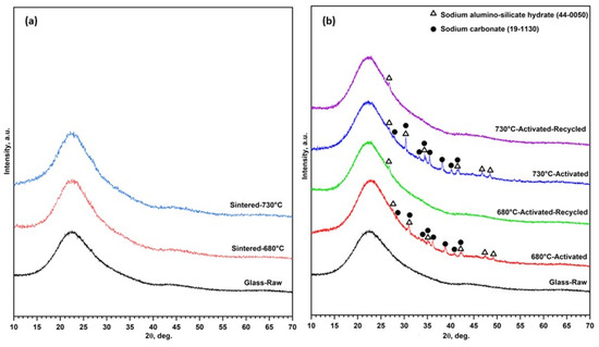 (a) XRD of glass sintered at 680 and 730 °C; (b) XRD of activated and recycled activated glass sintered at 680 and 730 °C.