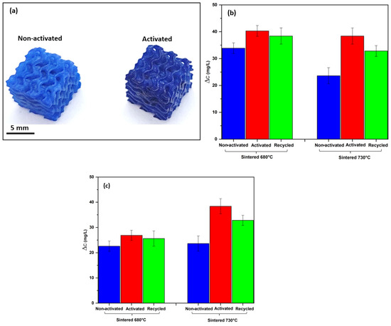 (a) Adsorption of methylene blue of activated and non-activated printed gyroid fired at 730 °C; (b) the uptake of methylene blue by the same weight of non-activated, activated and recycled gyroids; (c) the uptake of methylene blue by the same volume of non-activated, activated and recycled gyroids.