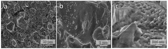 Microstructural details of gyroid scaffolds: (a) fired at 680 °C; (b) the recycled gyroid fired at 680 °C; and (c) the recycled gyroid fired at 730 °C.