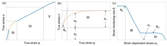 The strain hardening behavior of face-centered cubic metals can be divided into five separate stages [,]. The stage III of the stress–strain curves describes the evolution of dislocations by cross-slip movement: the formation and annihilation of subgrains. Stage III prevails in polycrystals such as microalloyed steels and represents the main focus of this work (Figure 1a). At this stage—which is very sensitive to temperature and strain rate—the true stress σ rises while the strain hardening rate θ decreases. The parameter θ is defined as dσ/dφ, with φ describing the true strain. The true stress σ of the stress–strain curves during deformation is the result of the contributions of the slightly strain-dependent initial yield stress σ0 and the strongly strain-dependent plastic stress σP (Figure 1b), the latter being controlled by the dislocation density development. Figure 1c shows that θ plotted against σP—known as Kocks-plot—reveals a linear relationship between the strain hardening rate θ0 at the beginning and the saturation stress σ∞ at the end of stage III. The strain hardening rate reaches a plateau at θIV in stage IV [,].